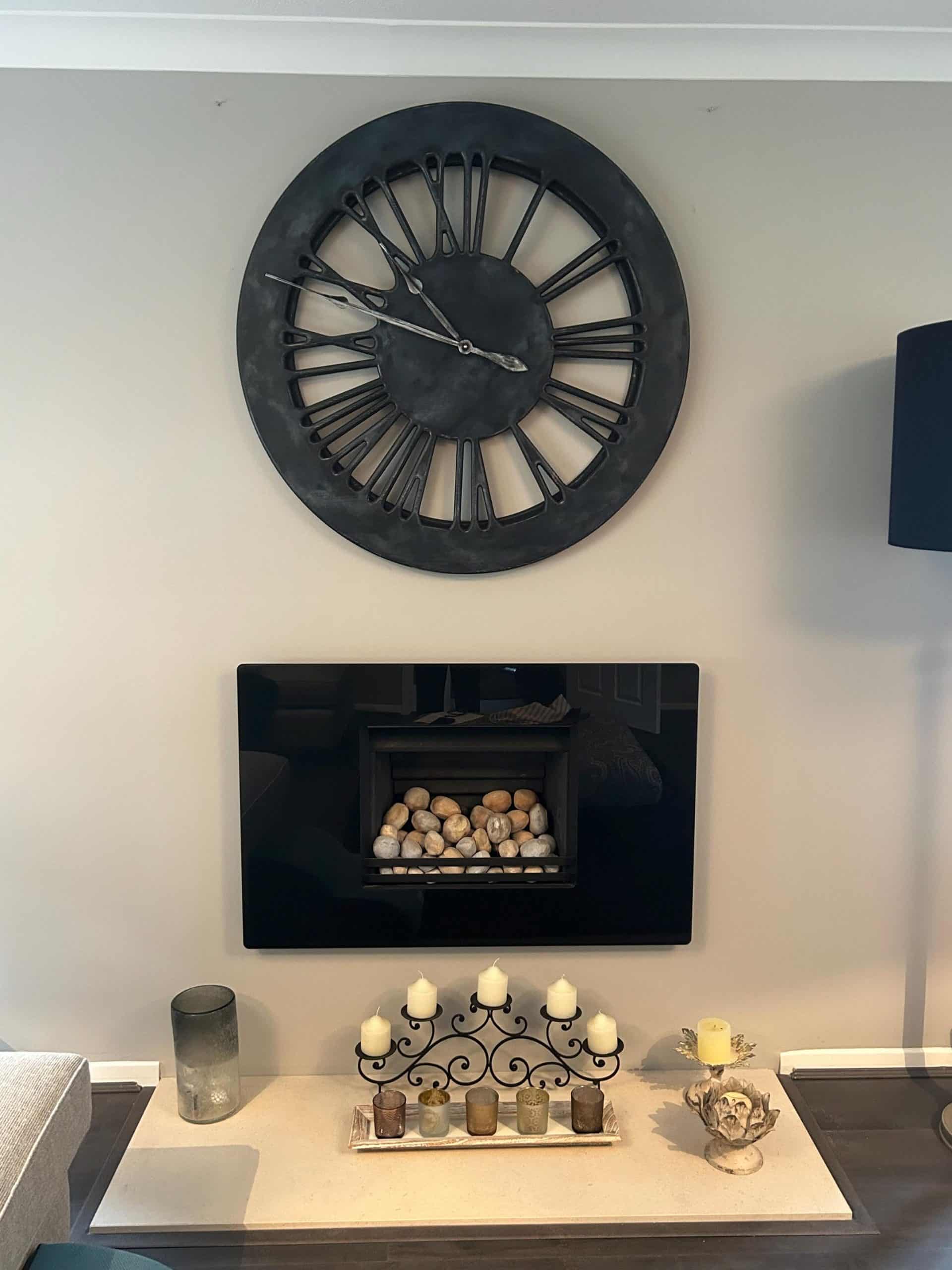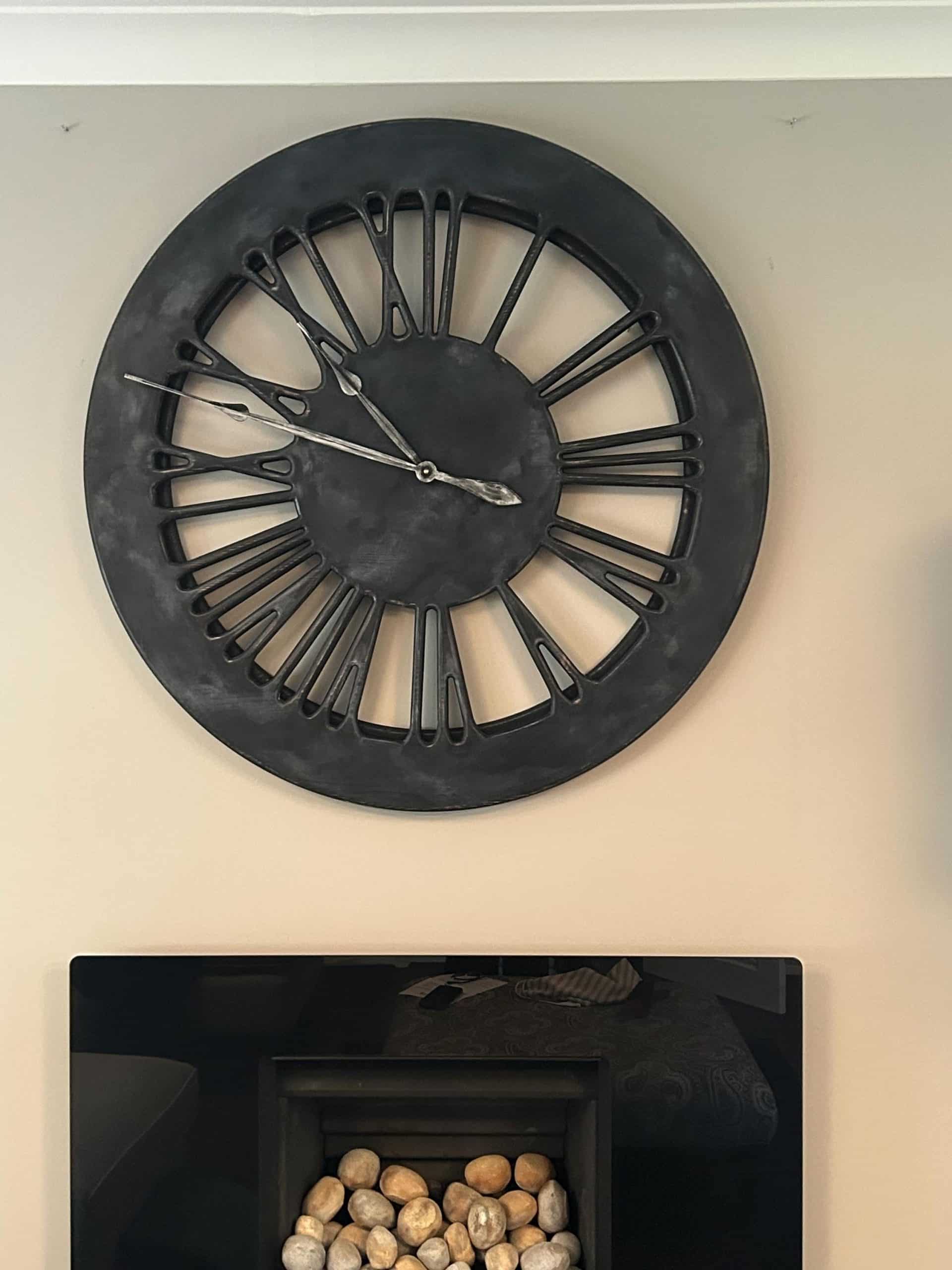 Zaprojektowaliśmy i wykonaliśmy ten niezwykły zegar, aby spełnić wymagania konkretnego klienta. Gdy otrzymaliśmy kilka zdjęć salonu, stało się jasnym, że ciemny zegar w odcieniach szarości sprawi się tutaj dobrze. Zaproponowaliśmy wykonanie tarczy z cyframi rzymskimi w kolorach podobnych do tych z szarego zegara ściennego, który ostatnio wyprodukowaliśmy. Aby upewnić się, że łatwo jest odczytać godzinę, dostarczyliśmy dwie opcje wskazówek: srebrną i złotą.